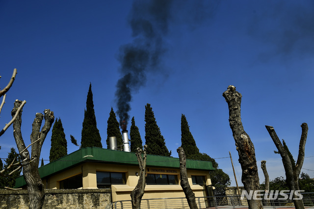 [로그로뇨=AP/뉴시스]28일(현지시간) 스페인 북부 로그로뇨 소재 한 묘지 화장터에서 연기가 솟고 있다. 스페인에선 28일(현지시간) 기준 신종 코로나바이러스 감염증(코로나19)으로 인한 누적 사망자가 5800명을 넘어섰다. 2020.03.29.