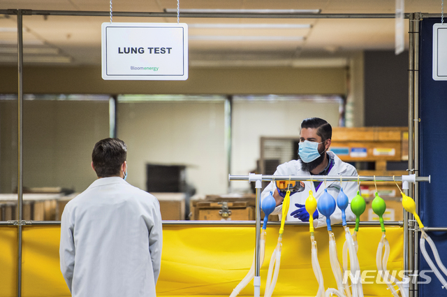 [서니베일=AP/뉴시스]28일(현지시간) 미 캘리포니아주 서니베일의 블룸 에너지 검사실에서 이곳 직원들이 산소호흡기 테스트를 하고 있다. 연료전지 발전기 제조업체인 블룸 에너지는 신종 코로나바이러스 감염증 여파로 환자가 늘어나 산소호흡기가 부족하게 되자 호흡기 생산에 나섰다. 2020.03.29.