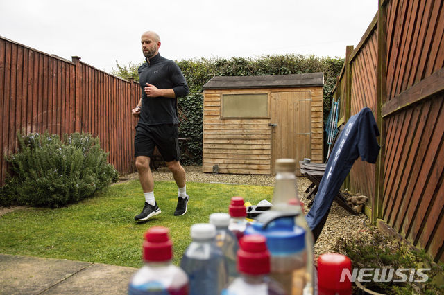 [첼트넘=AP/뉴시스]영국의 전 육상선수 제임스 캠벨이 1일(현지시간) 영국 첼트넘 자신의 집 마당에서 국민건강보험(NHS) 기금 마련을 위해 자선 마라톤을 하고 있다. 신종 코로나바이러스 감염증 확산 예방을 위해 전국이 폐쇄된 가운데 7m 길이의 뒷마당에서 달리기하며 생일을 보내는 캠벨은 마라톤 전 구간을 달리기 위해 마당을 약 7천 번 왕복한다. 2020.04.02.