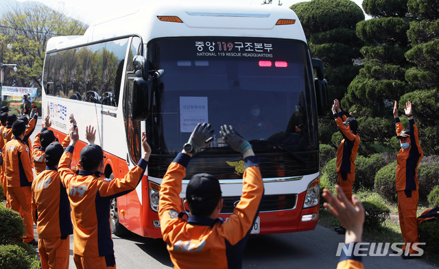 [대구=뉴시스] 이윤청 기자 = 소방대원들이 2일 대구 달서구 옛 두류정수장에서 신종 코로나바이러스 감염증(코로나19) 관련 업무를 마친 중앙119구조본부 버스를 환송하고 있다. 코로나19가 확산세였을 때 전국 각지에서 앰뷸런스가 옛 두류정수장으로 집결해 환자수송 업무에 투입됐다. 구급대원들은 이날 업무를 마치고 각자 소속된 곳으로 복귀한다. 2020.04.02.