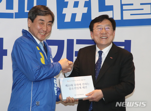 이종걸 선대위원장에게 중소기업계 총선 과제 전달하는 김기문 회장