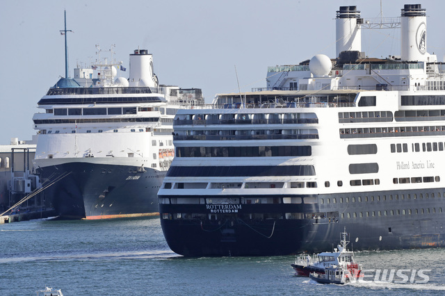 [포트로더데일=AP/뉴시스]신종 코로나바이러스 감염증(코로나19)으로 바다를 떠돌던 유람선 로테르담호가 2일(현지시간) 미 플로리다주 포트 로더데일의 에버글레이즈 항에 정박하기 위해 앞서 정박한 잔담호를 지나가고 있다. 잔담호에선 지난달 22일부터 승객 83명과 승무원 136명이 독감 증상을 보였으며, 승객 8명은 코로나19 양성 판정을 받았다. 승객 4명이 배에서 사망했지만 정확한 원인은 밝혀지지 않았다. 로테르담호에선 승객 14명이 독감 증상을 보인 것으로 전해졌다. 2020.04.03.