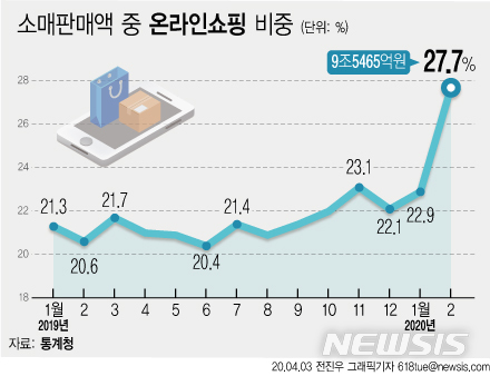 [그래픽]소매판매액 중 온라인 비중 27.7% …코로나19에 온라인 소비↑