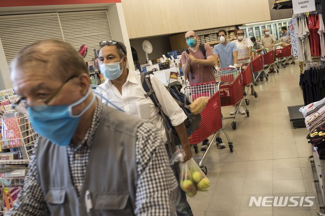 [리마=AP/뉴시스]3일(현지시간) 페루 수도 리마의 한 슈퍼마켓에서 장보기를 마친 페루 남성들이 계산을 위해 줄 서 있다. 신종 코로나바이러스 감염증의 확산으로 보건 비상사태가 발효 중인 페루는 성별로 사람들의 이동을 제한하면서 금요일에는 남성만 생필품을 사기 위해 집에서 나올 수 있다. 2020.04.04.
