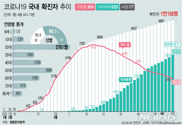 [서울=뉴시스]질병관리본부에 따르면 4일 오전 0시 기준 국내 코로나19 확진자는 총 1만156명이다. 이 중 6325명이 완치 후 격리해제됐다. 전체 누적환자 중 격리해제 환자를 의미하는 완치율은 62.2%를 기록했다. (그래픽=전진우 기자)