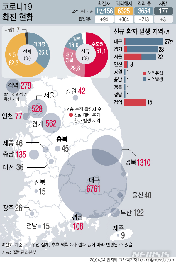 [서울=뉴시스]4일 질병관리본부에 따르면 이날 오전 0시 현재 새로 확인된 확진 환자 94명 중 48명은 수도권에서 확인됐다. 공항·항만 등 검역 과정에서 확인된 확진자는 15명이었다. (그래픽=안지혜 기자)