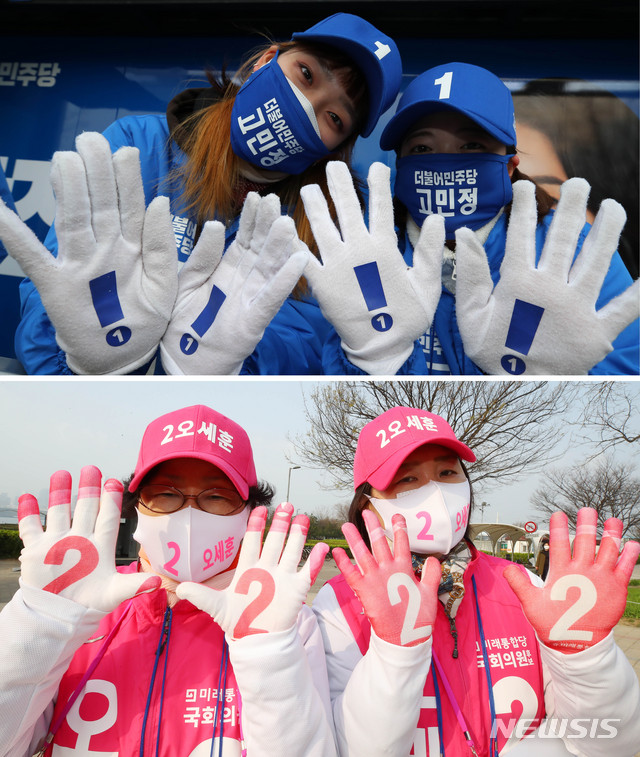 [서울=뉴시스] 장세영 기자 = 고민정(위) 더불어민주당 21대 총선 광진을 후보 선거사무원과 오세훈 미래통합당 21대 총선 광진을 후보의 선거사무원이 4일 서울 광진구 뚝섬안내센터앞 한강공원에서 손바닥에 기호 1번과 2번을 각각 보여주며 유세를 하고 있다. 2020.04.04.