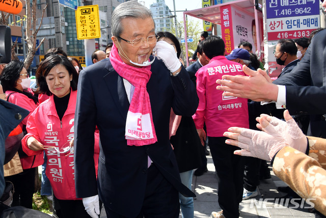 [부산=뉴시스] 하경민 기자 = 김종인 미래통합당 총괄선대위원장이 4일 오후 부산 영도구의 한 도로변에서 황보승희(중구·영도구) 후보자의 지원유세를 한 뒤 이동하고 있다. 2020.04.04.