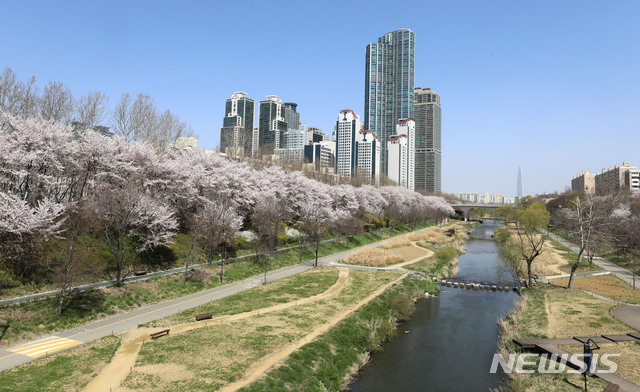 [서울=뉴시스]홍효식 기자 = 신종 코로나바이러스 감염증(코로나19) 확산 방지를 위해 양재천 벚꽃길이 '사회적 거리두기' 차원에서 전면 통제된 4일 서울 강남구 양재천 산책로가 상춘객 없이 한산한 모습을 보이고 있다. (사진=강남구 제공) 2020.04.04.