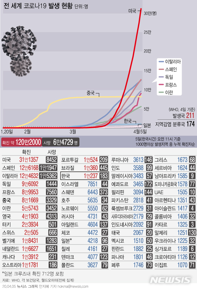 [그래픽]전 세계 코로나19 현황…확진 120만명 넘어