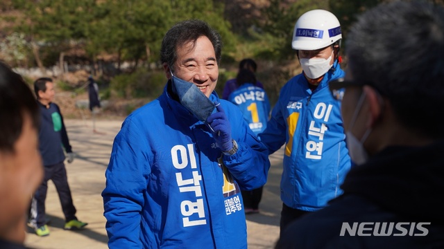[서울=뉴시스]김진아 기자 = 더불어민주당 서울 종로 이낙연 후보가 5일 서울 종로구 와룡공원에서 시민들과 인사를 나누고 있다. (사진=이낙연 캠프 제공). 2020.04.05.