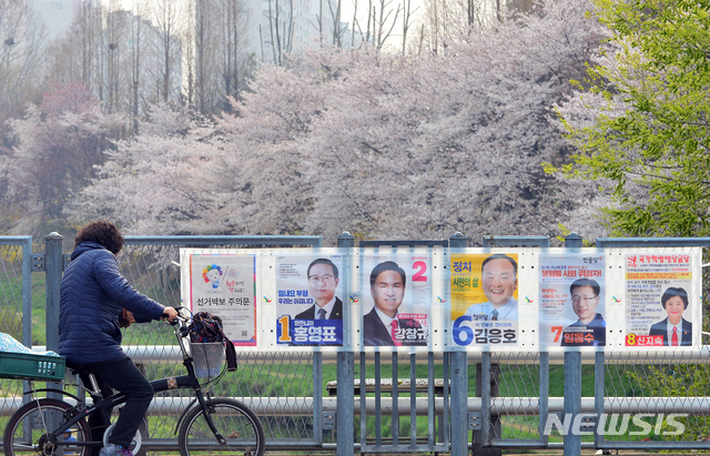 [인천=뉴시스] 이종철 기자 = 자전거를 탄 시민이 7일 오전 인천 부평구 굴포천에서 부평구을 21대 총선 후보자의 벽보를 보고 있다. 2020.04.07.