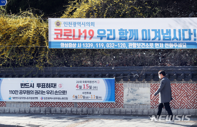 [인천=뉴시스] 이종철 기자 = 8일 오전 인천시 남동구 인천시청 후문에 신종 코로나감염증(코로나19)을 함께 이겨내자는 현수막과 21대 국회의원선거 반드시 투표하자는 현수막이 동시에 걸려 있다. 2020.04.08.