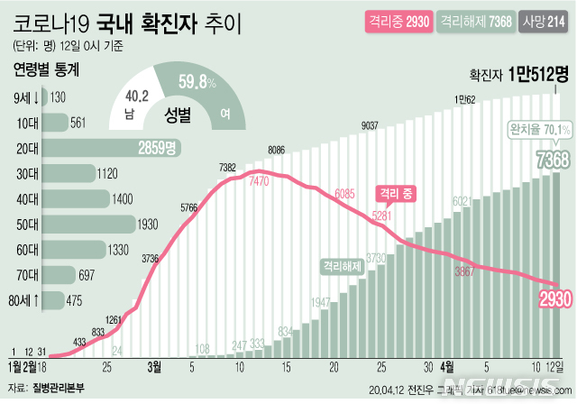 [서울=뉴시스]질병관리본부에 따르면 12일 오전 0시 기준 국내 코로나19 확진자는 총 1만512명이다. 이 중 7368명이 완치 후 격리해제됐다. 전체 누적환자 중 격리해제 환자를 의미하는 완치율은 70.1%를 기록했다. (그래픽=전진우 기자)