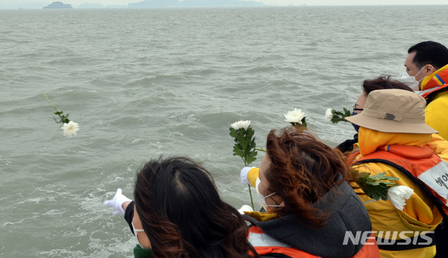 [진도=뉴시스]변재훈 기자 = 세월호 참사 6주기를 닷새 앞둔 12일 오전 희생자 가족들이 전남 진도군 관매도 인근 사고 해역을 찾아 헌화하고 있다. 2020.04.12.