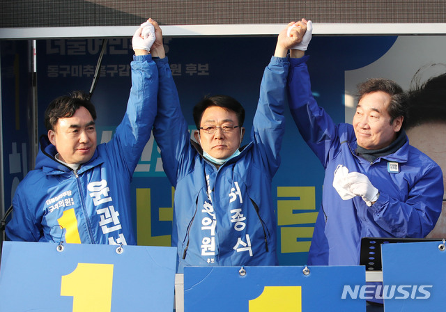 [인천=뉴시스] 김진아 기자 = 이낙연 더불어민주당 공동상임선대위원장이 12일 인천 주안역인근에서 인천 동구미추홀구갑 허종식 후보, 동구미추홀구을 남영희 후보 지원유세를 하기 전 허종식 후보와 포즈를 취하고 있다. 2020.04.12.