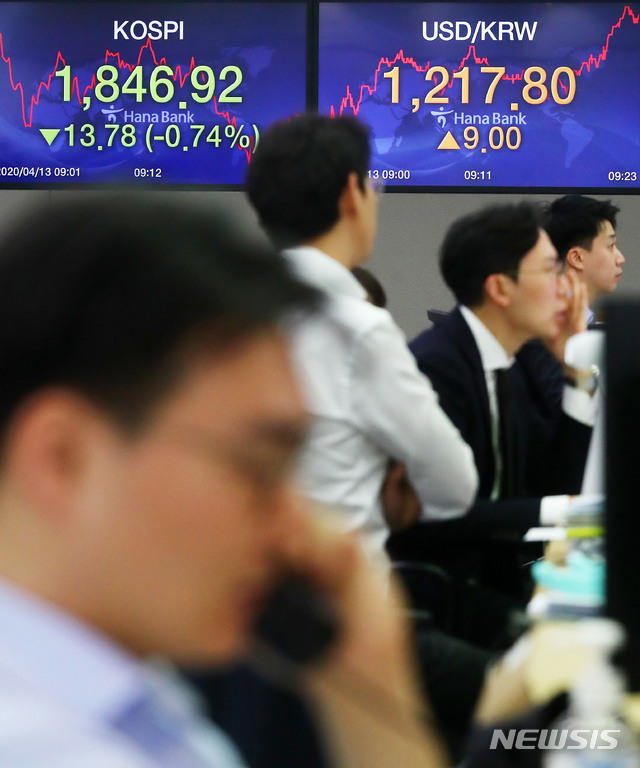 [서울=뉴시스]홍효식 기자 = 코스피-코스닥 지수가 하락 개장한 13일 오전 서울 중구 하나은행 딜링룸에서 딜러들이 업무를 보고 있다. 이날 코스피지수는 전 거래일(1860.70)보다 7.40포인트(0.40%) 내린 1853.30, 코스닥지수는 전 거래일(611.26)보다 1.32포인트(0.22%) 내린 609.94, 원·달러 환율은 전 거래일(1208.8원)보다 5.2원 오른 1214.0원에 출발했다. 2020.04.13.