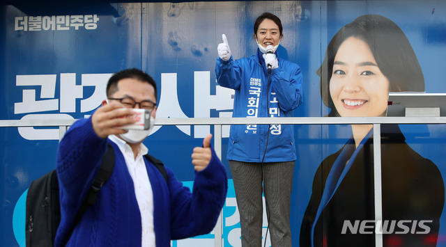 [서울=뉴시스] 고범준 기자 = 제21대 국회의원선거 광진구을에 출마한 고민정 더불어민주당 후보가 14일 오전 서울 광진구 테크노마트 앞 인근 도로에서 시민들과 함께 사진을 찍고 있다. 2020.04.14.