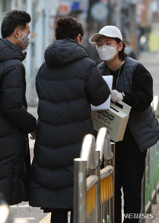 [서울=뉴시스]박주성 기자 = 제21대 국회의원선거 당일인 15일 오전 서울 사당 제1동 제5투표소 앞에서 출구조사원들이 유권자들에게 출구조사를 하고 있다. 제21대 국회의원선거 방송3사 공동출구조사는 한국리서치, 코리아리서치, 입소스주식회사 등 조사기관 3곳이 선거당일 오전 6시부터 오후 6시까지 전국 2321개 투표소에서 투표자 약 51만 명을 대상으로 조사할 예정이다. 2020.04.15.