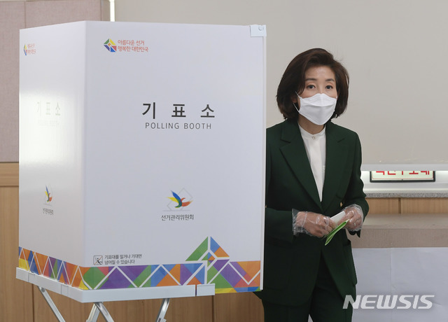 [서울=뉴시스]박주성 기자 = 제21대 국회의원선거 동작구을에 출마한 미래통합당 나경원 후보가 15일 오전 서울 동작구 사당1동 주민센터에서 투표를 마치고 기표소를 나서고 있다. 2020.04.15.