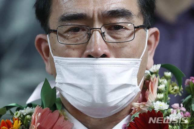 [서울=뉴시스] 최동준 기자 = 제21대 국회의원선거 강남구갑 태구민(태영호) 미래통합당 당선자가 16일 새벽 서울 강남구 선거사무소에서 애국가 제창을 하며 눈물을 흘리고 있다. 2020.04.16.