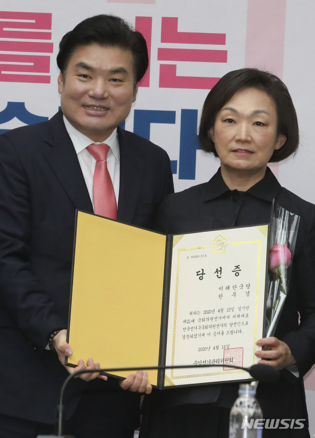 [서울=뉴시스]김명원 기자 = 원유철 미래한국당 대표가 17일 오전 서울 여의도 국회 제3회의장에서 열린 선대위 해단식에서 참석해 한무경 당선인에게 당선증을 전달하고 있다. 2020.04.17.