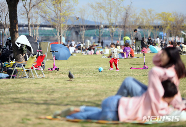[서울=뉴시스] 박미소 기자 = 신종코로나바이러스 감염증(코로나19) 국내 일일 신규확진자가 10명대로 줄어든 18일 오후 서울 영등포구 여의도 한강공원에 시민들이 돗자리를 깔고 여가시간을 보내고 있다. 2020.04.18.
