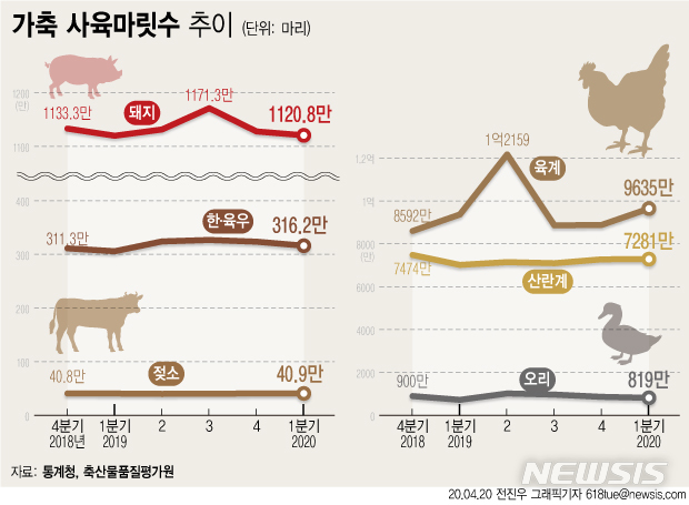 [서울=뉴시스]통계청과 축산물품질평가원이 20일 발표한 '2020년 1분기 가축동향조사 결과'에 따르면 올해 1분기(3월1일 기준) 국내에서 사육 중인 돼지 마릿수는 1120만8000마리로 전분기 대비 7만1000마리(-0.6%) 감소했다. (그래픽=전진우 기자)