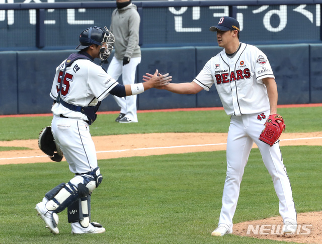 [서울=뉴시스] 전진환 기자 = 프로야구 키움 히어로즈와 두산 베어스의 무관중 연습경기가 열린 22일 오후 서울 잠실야구장에서 5대0으로 승리한 두산의 마무리투수 이용찬이 포수 이홍련의 축하를 받고 있다. 2020.04.22.