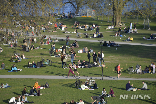 [스톡홀름=AP/뉴시스]22일(현지시간) 스웨덴 스톡홀름의 한 공원에 신종 코로나바이러스 감염증(코로나19) 발생에도 사람들이 모여 화창한 날씨를 즐기고 있다. 스웨덴 공중보건국은 5월 초까지 스웨덴 스톡홀름주 인구 3분의 1가량인 60여만 명이 코로나19에 걸릴 것으로 추산했다. 스웨덴은 코로나19 대응으로 적극 봉쇄 대신 집단 면역 대응으로 나서고 있으며 누적 확진자는 1만5322명, 사망자는 1765명으로 집계됐다. 2020.04.23.