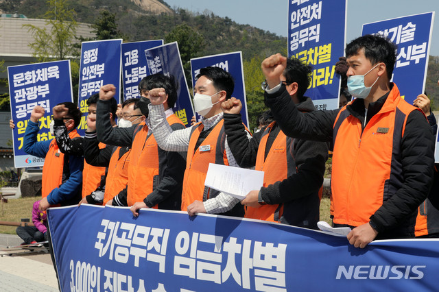 [서울=뉴시스]김병문 기자 = 민주노총 민주일반연맹 공공연대노동조합 관계자들이 23일 오전 서울 종로구 청와대 분수대 앞에서 국가공무직 임금차별 3,000인 집단소송 돌입 기자회견을 하고 있다. 2020.04.23.