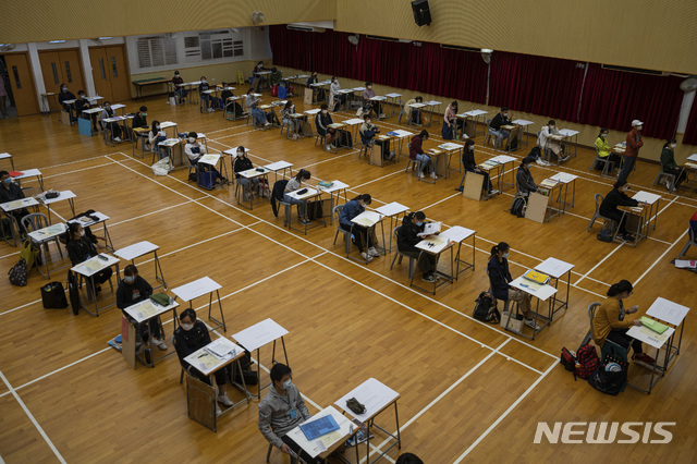 [홍콩=AP/뉴시스]24일(현지시간) 홍콩의 한 학교에서 신종 코로나바이러스 감염증(코로나19) 확산을 막기 위해 마스크를 쓴 학생들이 대학입시(DSE)를 치를 준비를 하고 있다. 홍콩에서는 올해 DSE에 응시하는 5만2천여 명의 수험생이 체온 검사와 사회적 거리 두기 조치를 준수하며 25일까지 시험을 치른다. 2020.04.24.