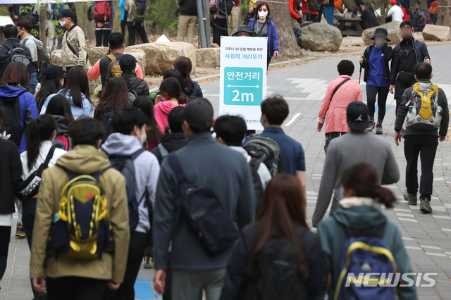 [서울=뉴시스] 이윤청 기자 = 국립공원공단 북한산사무소 직원들과 산악회 회원들이 25일 서울 은평구 북한산성탐방지원센터 인근 등산로에서 사회적 거리두기 실천을 홍보하고 있다. 이번에 환경부와 국립공원공단이 마련한 안전수칙에 따라 탐방객들은 ▲다른 사람과 2m 이상 거리두기 ▲국립공원 정상·쉼터 등에서 떨어져 앉고 오래 머물지 않기 ▲탐방로 우측 한줄 통행 ▲마스크 착용 및 손 씻기 등의 수칙을 지켜야 한다. 2020.04.25.
