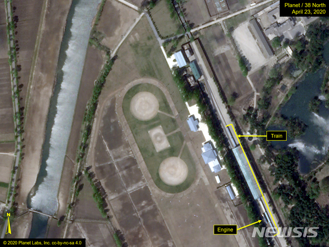 [원산=AP/뉴시스]플래닛랩스가 제공하고 북한 전문 분석 사이트 38노스가 주석을 단 23일 자 위성사진에 북한 원산의 철도역에 김정은 북한 국무위원장의 전용 추정 열차가 정차돼 있다. 38노스는 최근 이 지역의 위성사진을 분석해 김정은 위원장의 전용 열차로 보이는 열차가 적어도 지난 21일부터 원산 단지 내 철도역에 주차돼 있었다고 25일 밝혔다. 38노스는 길이 약 250m의 이 열차는 4월 15일에는 존재하지 않았지만 21일과 23일에는 정차해 있었다고 전했다. 2020.04.26.