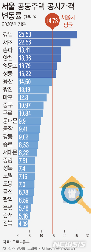 [서울=뉴시스] 올해 서울 공동주택 공시가격이 13년 만에 최고치인 14.73% 상승했다. 고가 주택이 밀집한 서울 강남구의 경우 25.53% 올랐다. (그래픽=안지혜 기자)