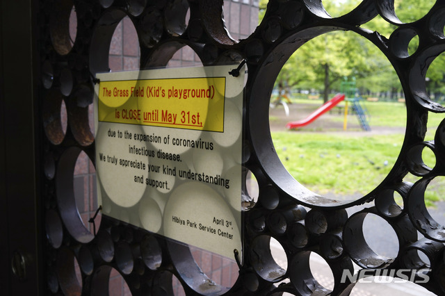 [도쿄=AP/뉴시스]28일 일본 도쿄의 한 공원 텅 빈 운동장 근처에 신종 코로나바이러스 감염증(코로나19) 예방을 위한 운동장 폐쇄 안내문이 붙어 있다. 일본 정부가 코로나19 확산에 대응해 긴급사태 선언을 전국으로 확대하는 등 방역에 총력을 기울이면서 신규 확진자가 28일 만에 200명 미만으로 떨어지는 등 어느 정도 진정 효과가 나오고 있다. 일본의 코로나19 확진자 수는 크루즈 환자 포함 1만4326명, 사망자는 407명이다. 2020.04.28.