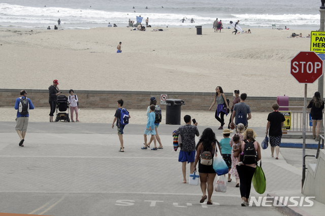 [헌팅턴비치=AP/뉴시스]4월 30일(현지시간) 미 캘리포니아주 헌팅턴비치에 사람들이 모이고 있다. 개빈 뉴섬 캘리포니아 주지사는 신종 코로나바이러스 감염증(코로나19) 확산 예방을 위해 오렌지 카운티 내 해변들에 대해 추후 통보가 있을 때까지 폐쇄 명령을 내렸다. 뉴섬 주지사는 화창한 지난 주말 오렌지 카운티 주민 수만 명이 해변을 가득 메운 지 며칠 만에 이같은 조치를 내렸다. 2020.05.01.