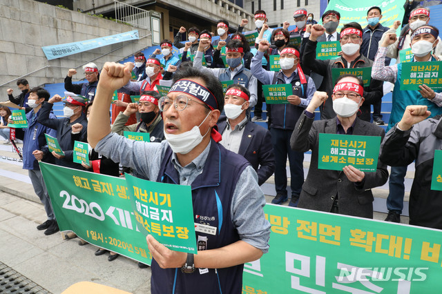 [서울=뉴시스] 박민석 기자 = 전국민주노동조합총연맹 조합원을 비롯한 관계자들이 1일 오전 서울 종로구 세종문화회관 앞에서 세계 130주년 노동절 기념 '2020 세계노동절 민주노총 선언' 기자회견을 열고 재난 시기 해고 금지, 생계 소득 보장, 전 국민 고용보험 도입, 사회안전망 쟁취 등을 촉구하고 있다. 2020.05.01.
