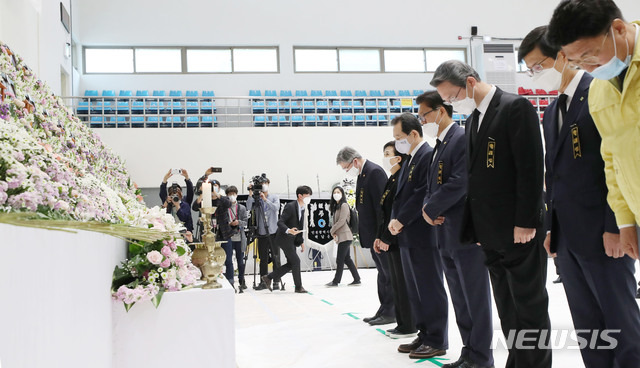 [이천=뉴시스]홍효식 기자 = 정세균 국무총리 등이 3일 오전 경기도 이천시 서희청소년문화센터에 마련된 한익스프레스 물류창고 화재 합동 분향소를 방문해 추모 묵념하고 있다. 2020.05.03.