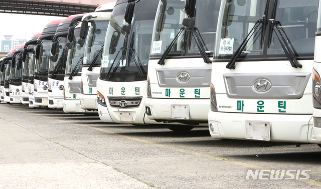 [서울=뉴시스] 전진환 기자 = 3일 오전 서울 송파구 탄천주차장에 신종 코로나바이러스 감염증(코로나19) 여파로 수입이 급감한 관광버스업체들이 차량 보험료를 줄이기 위해 번호판을 뜯어내고 휴차 신청을 한 관광버스들이 줄지어 서 있다. 2020.05.03.