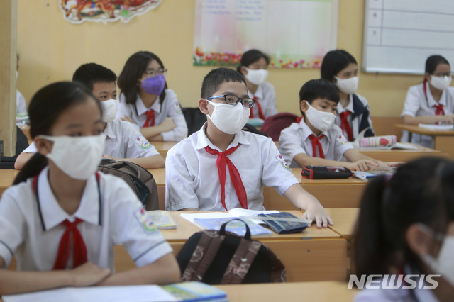[하노이=AP/뉴시스]4일(현지시간) 베트남 수도 하노이의 딘꽁 중학교에서 마스크를 쓴 학생들이 수업하고 있다. 베트남 전역의 학생들은 신종 코로나바이러스 감염증(코로나19)의 확산을 막기 위한 3개월간의 휴교와 온라인 수업을 마치고 이날 개학을 맞았다. 2020.05.04.