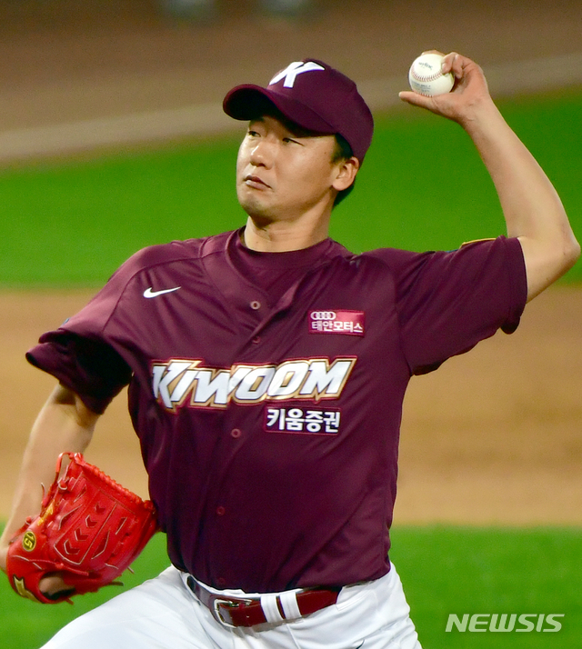 [광주=뉴시스] 류형근 기자 = 6일 오후 광주 북구 광주-기아챔피언스필드에서 열린 2020프로야구 KIA 타이거즈 대 키움 히어로즈의 경기, 7회말 무사에서 등판한 키움 바뀐투수 오주원이 역투하고 있다. 2020.05.06.