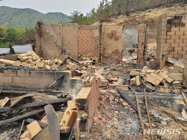[고성(강원)=뉴시스] 장경일 인턴기자 = 지난 1일 강원도 고성군에서 발생한 큰불로 산림 85㏊가 소실된 화재 사건의 원인 규명을 위한 경찰의 2차 현장 감식이 진행된 7일 오후 불이 처음 시작된 고성군 토성면 도원리 산195-4 주택이 화마의 열기에 무너져 내린 모습이 처참하다. 2020.05.07.