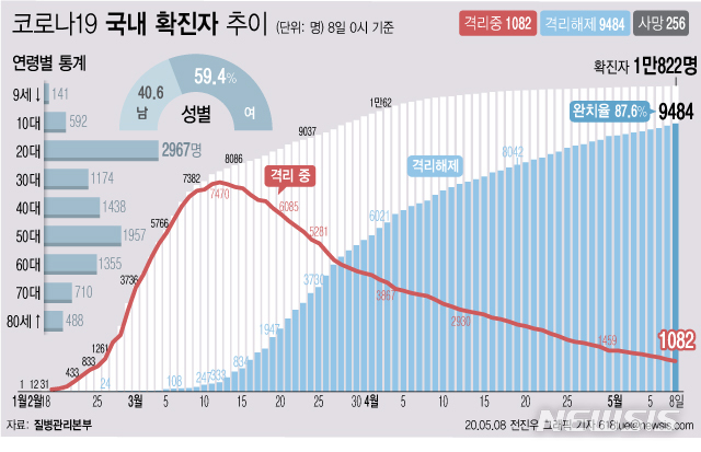 [서울=뉴시스]질병관리본부에 따르면 8일 오전 0시 기준 국내 코로나19 확진자는 총 1만822명이다. 이 중 9484명이 완치 후 격리해제됐다. 전체 누적환자 중 격리해제 환자를 의미하는 완치율은 87.6%를 기록했다. (그래픽=전진우 기자)