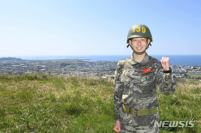 [서울=뉴시스]해병대사령부는 8일 토트넘 홋스퍼 손흥민 선수의 기초군사훈련 모습을 공개했다. 사진은 손흥민이 제주도 모슬포 일대에서 단독무장행군을 하는 도중 파이팅 포즈를 하는 모습. (사진=해병대 페이스북)  2020.05.08.
