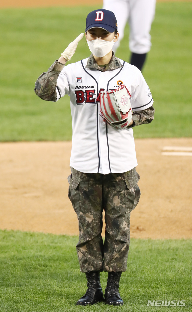 [서울=뉴시스] 이영환 기자 = 국군춘천병원 응급간호장교 김혜주 대위가 8일 오후 서울 송파구 잠실야구장에서 열린 2020 신한은행 SOL KBO리그 두산 베어스 대 kt 위즈의 경기에서 시구에 앞서 경례를 하고 있다. 김 대위는 지난 2월 23일부터 3월 21일까지 4주 동안 대구 동산병원 1차 군 의료지원팀으로 파견되어 대구시 코로나19 확진 환자 입원 치료를 지원했다. 2020.05.08.