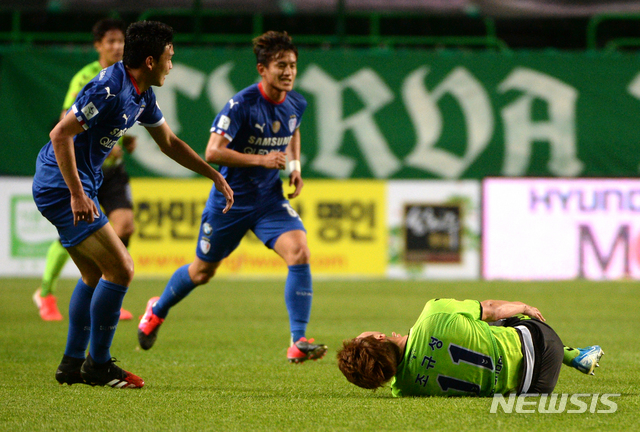 [전주=뉴시스] 김얼 기자 = 8일 전북 전주시 전주월드컵경기장에서 열린 하나원큐 K리그1 2020 공식 개막전 전북현대와 수원삼성의 경기에서 전북현대 조규성 선수가 통증을 호소하고 있다. 2020.05.08.