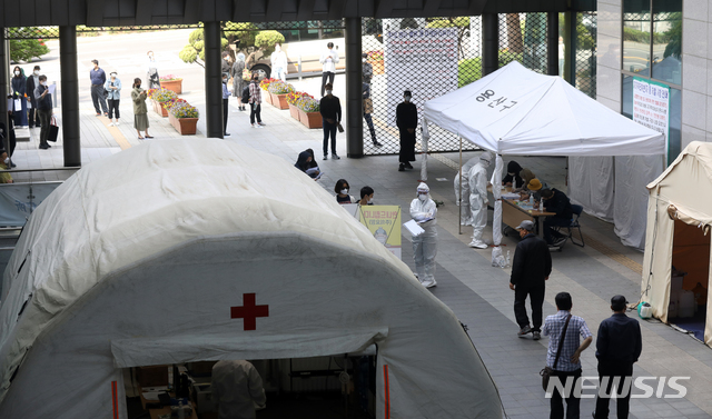 [서울=뉴시스] 이윤청 기자 = 이태원 클럽 집단 감염 영향으로 신종 코로나바이러스 감염증(코로나19) 확산이 우려되는 가운데 11일 서울 용산구보건소 선별진료소가 시민들로 붐비고 있다. 2020.05.11.