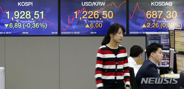 [서울=뉴시스]최진석 기자 = 12일 코스피지수가 전 거래일(1935.40)보다 3.22포인트(0.17%) 오른 1938.62에 코스닥지수는 전 거래일(685.04)보다 2.44포인트(0.36%) 오른 687.48에 장을 시작 했다. 서울 외환시장에서 원·달러 환율은 전 거래일(1220.5원)보다 3.5원 오른 1224.0원에 출발했다. 사진은 이날 오전 서울 중구 하나은행 딜링룸의 모습. 2020.05.12.
