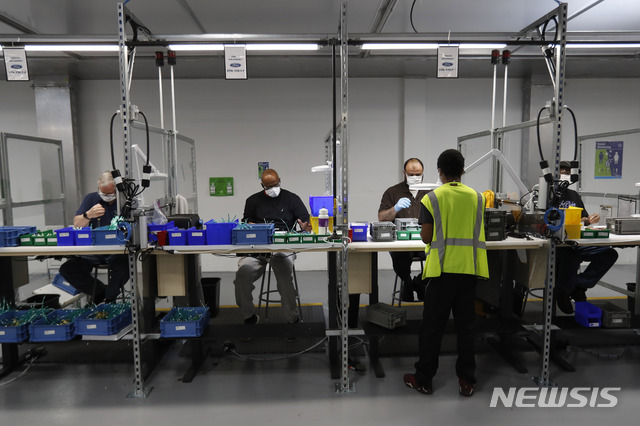 [입실랜티=AP/뉴시스]13일(현지시간) 미 미시간주 공업도시 입실랜티의 포드자동차 공장에서 직원들이 인공호흡기를 생산하고 있다. 신종 코로나바이러스 감염증(코로나19)과 싸우는 병원들이 의료장비 부족을 호소하면서 이 공장은 인공호흡기 공장으로 전환해 오는 7월 4일까지 인공호흡기 5만 개를 납품하기로 돼 있다. 최근 코로나19 제재가 완화되면서 이 공장은 18일부터 단계적으로 자동차 부품 생산을 재개한다고 밝혔다. 2020.05.14.